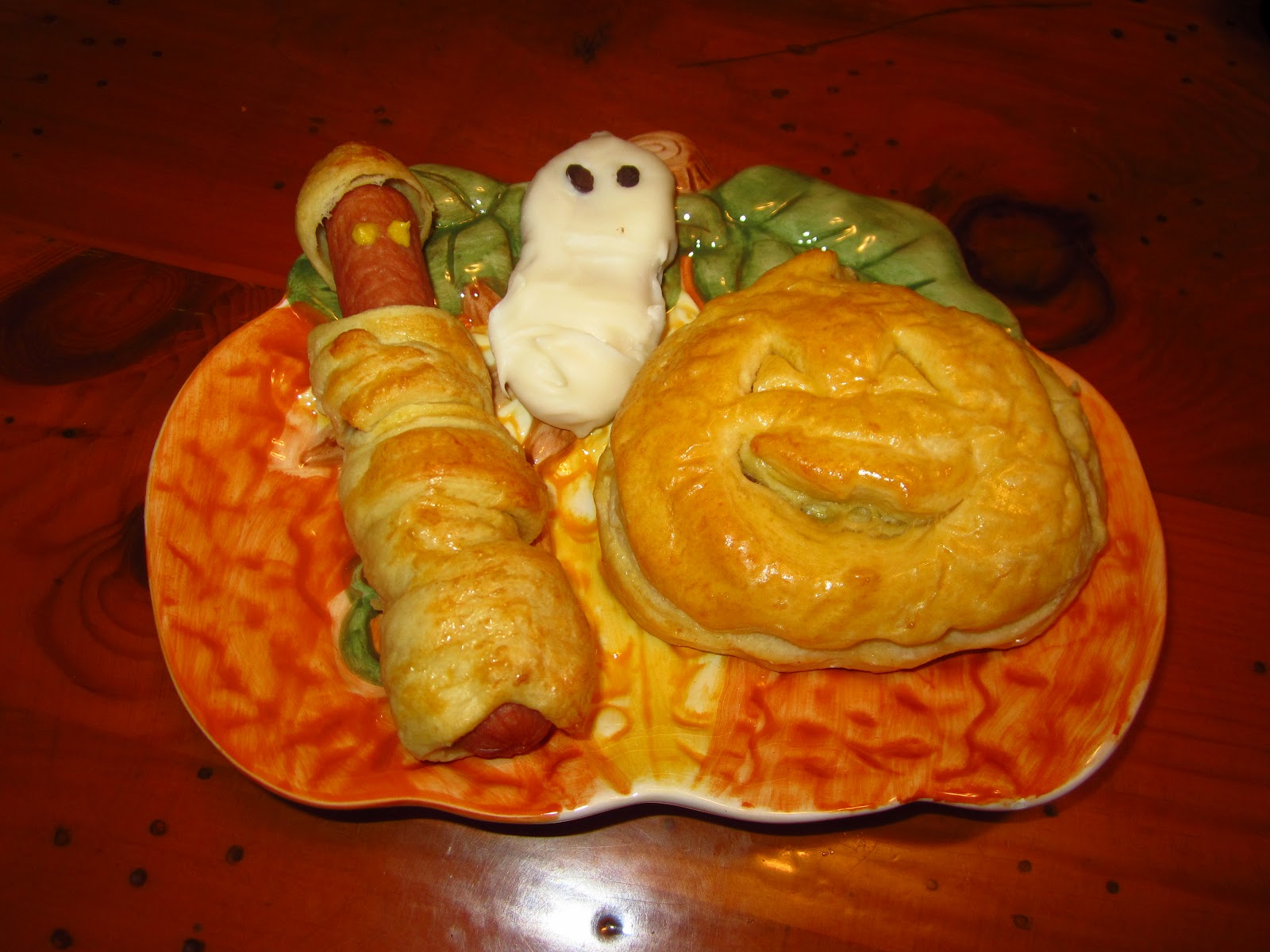 I made these mummy wrap hot dogs as well from crescent rolls and hot dogs. This recipe is not in the book, but went well with the others.